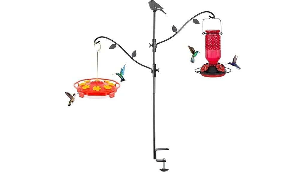 You’ll find the FEED GARDEN Deck Bird Feeder Pole a practical, tool-free clamp-on option for hanging feeders and plants from horizontal deck rails up to 2.1 inches thick. It includes a 41-inch powder-coated steel pole, detachable sections for customization, and hand-adjustable clamp knobs that tighten without tools. The powder finish resists weather but inspect after storms and avoid heavy loads in high winds. Keep going to see installation tips, durability notes, and alternatives.
